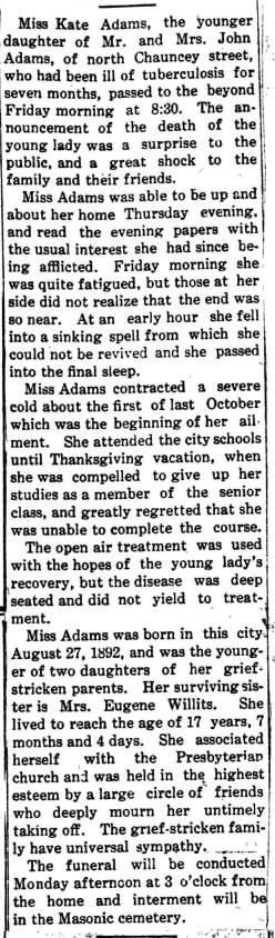 E. Adams passed into the eternal sleep at her home on North Walnut street… Hattie A.